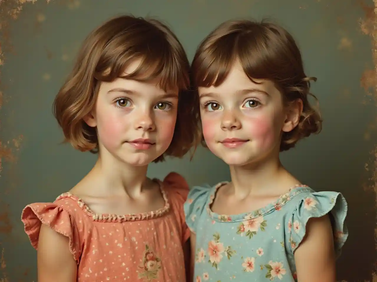 Picha ya zamani ya wasichana wawili wenye nywele fupi wakiwa wamesimama kando ya kila mmoja, mtindo wa James Bidgood, mtazamo wa mbele, upana, maelezo ya juu, rangi za wazi