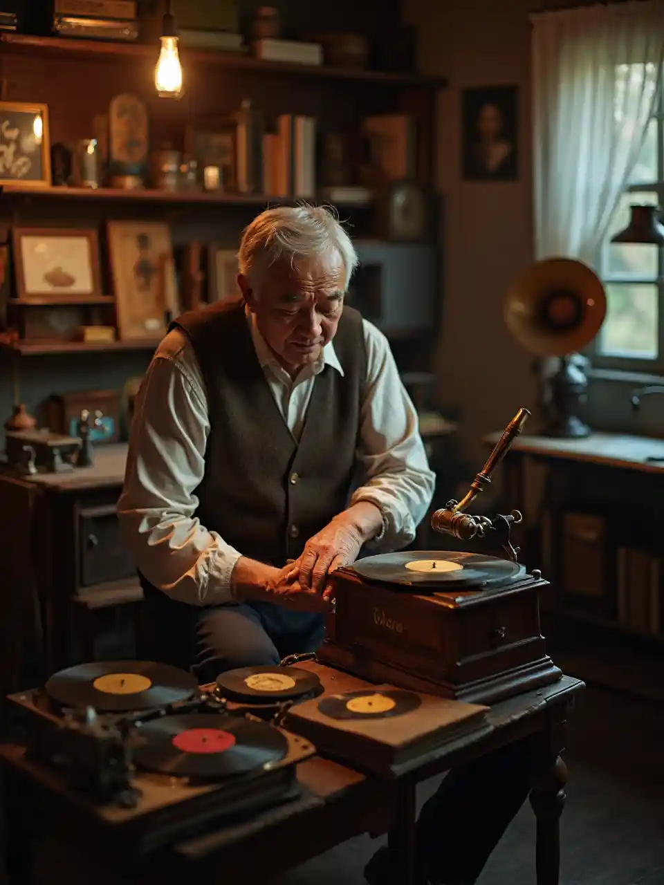 Mwanamume mmoja Msia mwenye umri wa miaka 50 hivi, akiwa katika chumba cha juu, akirudisha gramafoni ya zamani, anajifunzia mavazi ya ndani. Rekodi za kale na taa ya joto humweka ndani, mikono yake yenye ustadi na umakini wake unaonyesha shauku ya kiufundi na msisimko wa kusikitika katika nafasi ya utu.