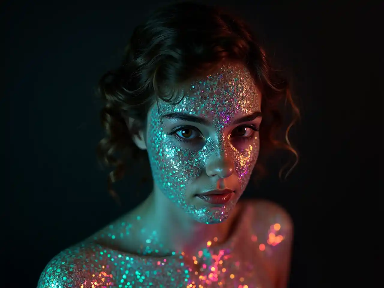 KingstonPicha ya msichana mwenye magamba badala ya ngozi, vifaa vya holographic vinang'aa kwa mwendo, picha ya kweli, background nyeusi, picha ya miaka ya 1920, rangi za wazi, rangi za tofauti