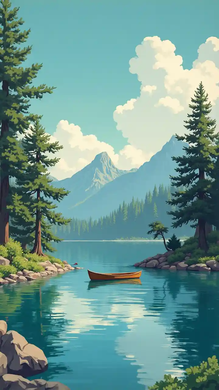 Picha yenye rangi nyingi ya miaka ya 1940 ya ziwa lenye mashua, mialoni, anga ya bluu yenye mawingu