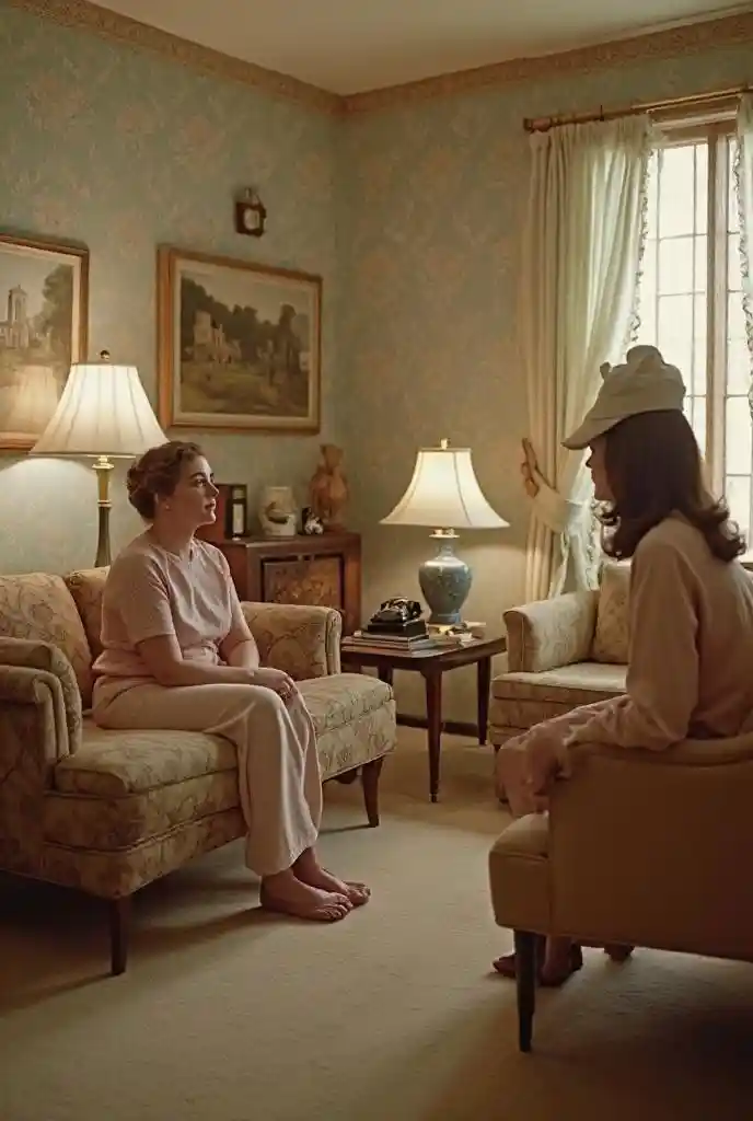 "Chumba cha kuishi cha miaka ya 1960, chenye fanicha za kisasa za katikati ya karne, simu ya kugeuza, karatasi za kugeuza, na watu waliovaa mavazi yanayofaa wakati huo