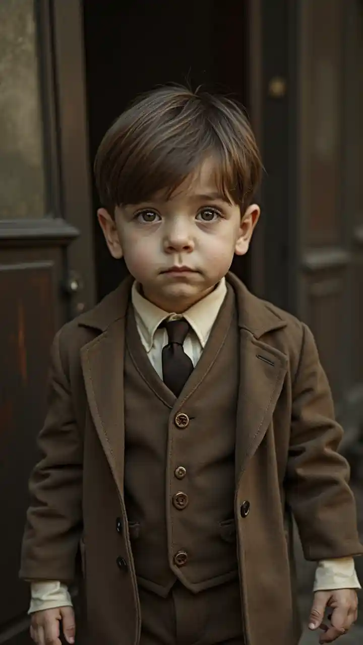 Picha hyper kweli kukamata mtoto amevaa kama gangster vintage, 50mm lensi, subtle filamu grain athari, risasi juu ya Kodak Portra 800, na tone kidogo sepia kwa hisia classic.