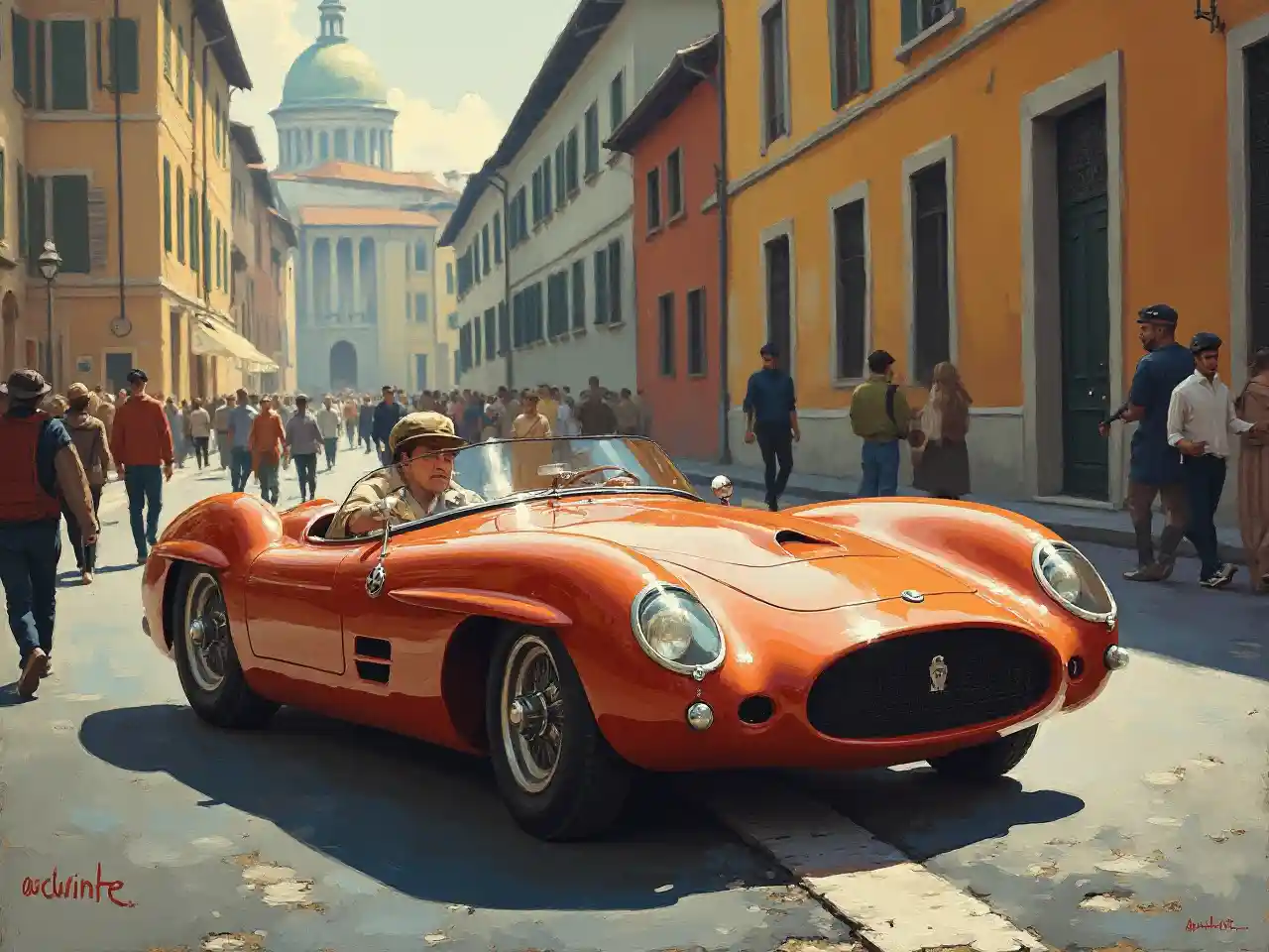 IsaiahSci fi michezo gari kutoka miaka ya 50 katika rangi ya mafuta mtindo wa Italia. Mahali pa tukio ni Roma ya miaka ya 1950.