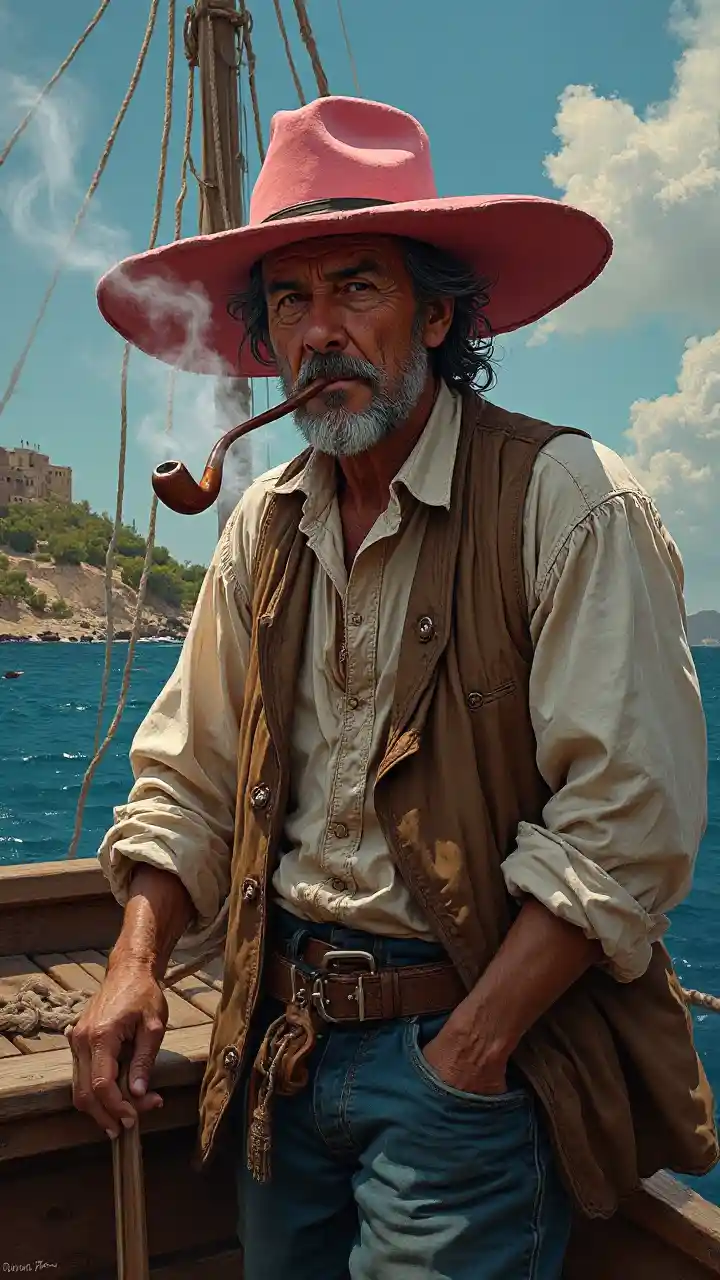 Jaxonhombre viejo, baharia, fumando pipa, fondo de barcos, sombrero rosa