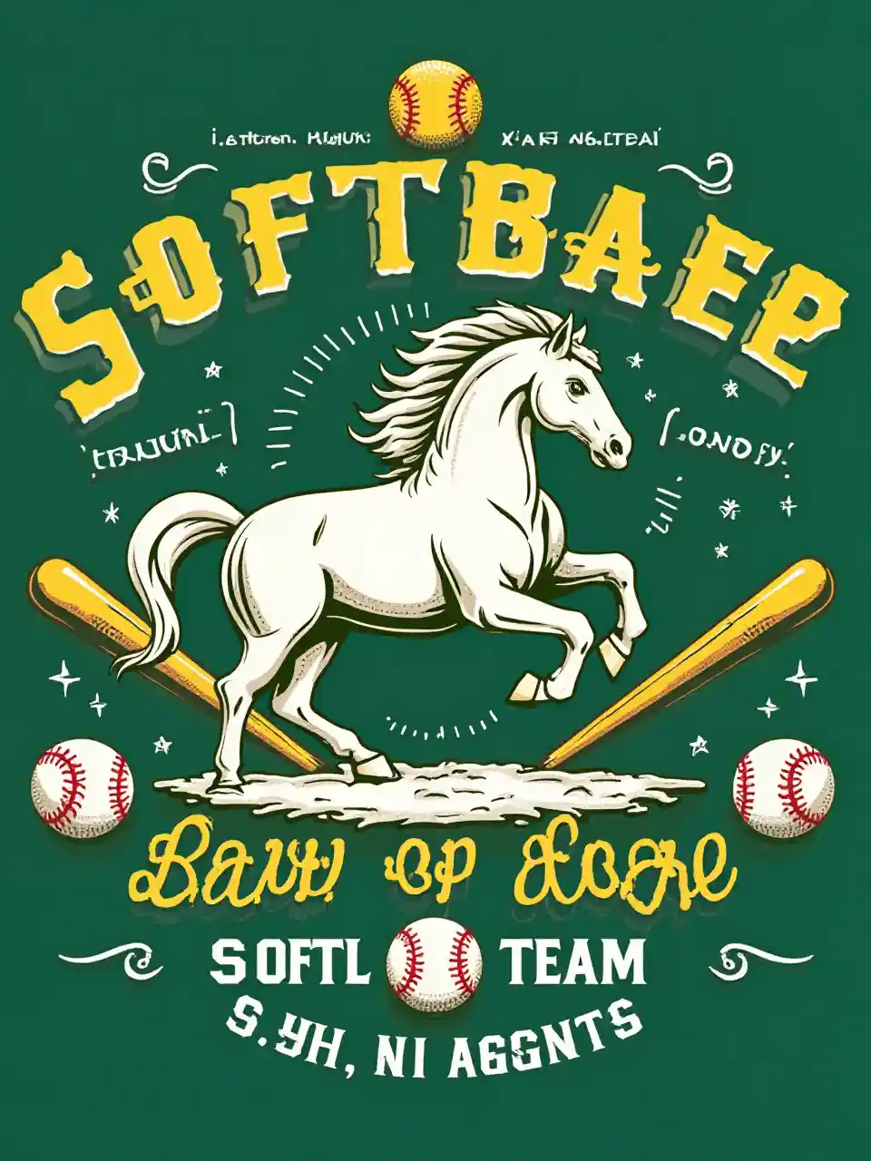 Nembo ya timu ya softball ya kawaida, yenye vipengele vya kubuni vya jadi, rangi za ujasiri kama kijani cha msitu, neon ya manjano na nyeupe, icon za softball, na alama za vintage. Hisia ya kutamani na kiburi na kivutio kisichoweza kupitwa na wakati, ikiamsha roho ya burudani ya Marekani. Bora kwa ajili ya wapenda michezo na watoza, iliyoundwa katika mtindo graphic high quality, kamili kwa ajili ya nguo na bidhaa. Jumuisha farasi mweupe