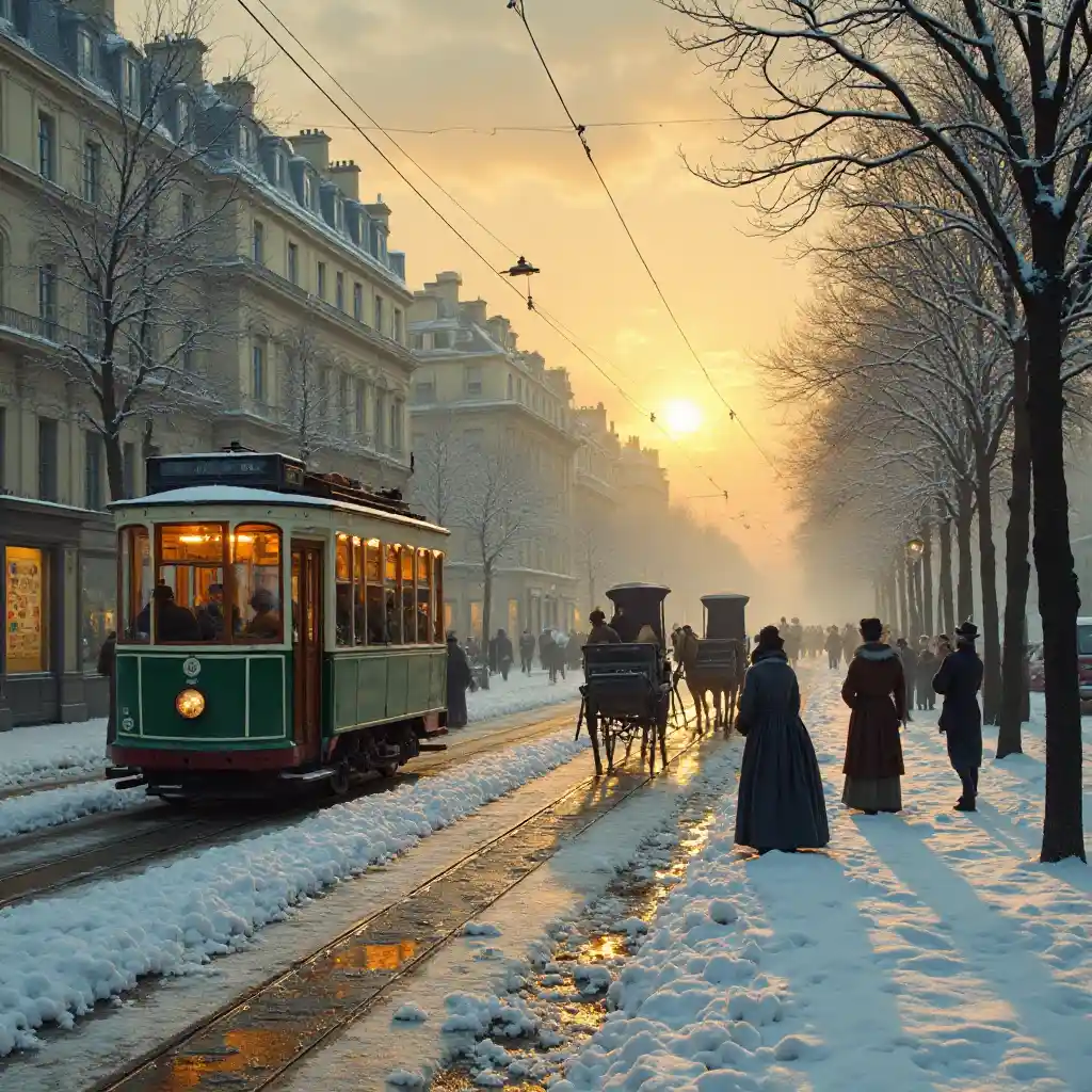 Mandhari ya jua kutua majira ya baridi mwishoni mwa karne ya 19 huko Paris . Barabara iliyofunikwa na theluji iliyochanganywa na matope inayoonyesha tracks za gari . Tramu ya kijani na mwanga wa ndani wa rangi ya machungwa . Magari mawili ya farasi barabarani . Miti iliyofunikwa na theluji imejipanga kando ya barabara . Jengo kubwa la kihistoria . Kume mto Seine unaonyesha taa za jioni . Kwenye barabara ya chini wanawake waliovalia mavazi ya karne ya 19 na kofia . Watoto na wanaume wenye kofia . Mabango ya aina ya silinda yanaonyesha picha za zamani ambazo zinaongeza hisia za kutamani mahali hapo . Ukungu
