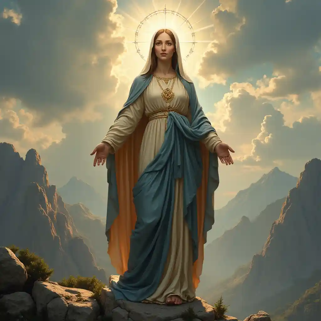 Bikira Maria mama wa Yesu mwili kamili na vazi nzuri na halo na miale ya mwanga kuja nje ya kichwa chake juu ya mlima, mazingira, tata, kifahari sana, uchoraji digital, sanaa dhana, umakini mkali, picha, kazi ya sanaa na Greg Rutkowski na Thomas Scholes na William - Adolphe Bouereau