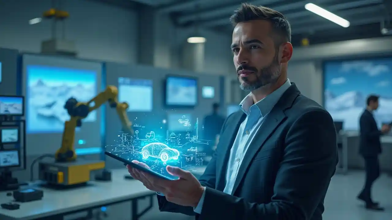 Mjasiriamali wa kiume mwenye maono, mwenye umri wa miaka 30 na kitu, mwenye asili ya Mashariki ya Kati, akiwa amevaa blazer ya kisasa yenye rangi nyepesi, akiwa amesimama katika ofisi ya teknolojia au maabara. Ana kompyuta ndogo iliyo na picha nyingi sana, inayoonyesha teknolojia ya roboti inayotegemea akili ya binadamu, kama vile mfumo wa magari yanayoendesha magari, ramani za dijiti, au chati ya mfumo wa neva. Anasema kwa uhakika na kwa uthabiti, kana kwamba anaeleza wazo hilo kwa wasikilizaji. Nyuma ni pamoja na mikono roboti, wachunguzi, na viwanda tech vipengele (kwa mfano, rasimu skrini, theluji picha ilipendekeza roboti ya hali ya hewa). Mwangaza ni safi na wa kitaalamu, na hisia za baadaye lakini za kweli.