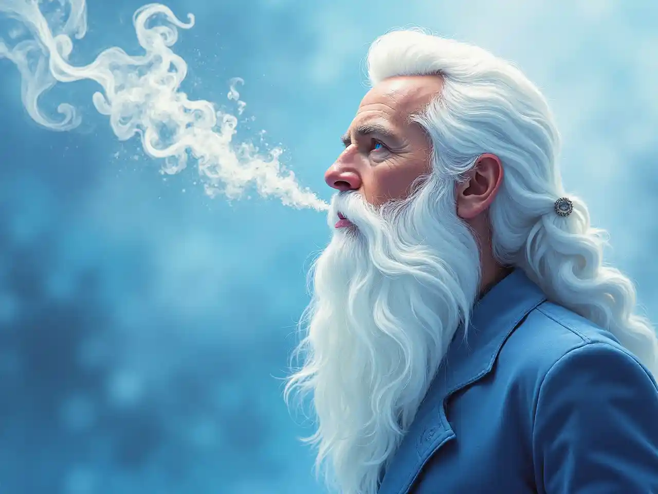 (((mchoro wa rangi ya hewa))), inayoonyesha (((mwanamume mwenye ndevu nyeupe na macho ya bluu))), ambaye pumzi yake ni (((kwa njia ya hewa ya barafu)) ambayo inalingana na (diamond)) dhidi ya (mwisho, baridi) katika mtindo ambao unatoa hisia za (kisasa, kisanii)