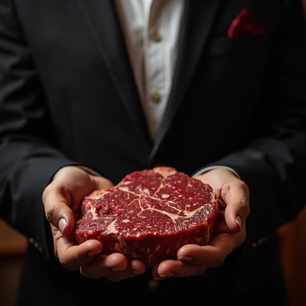 Picha ya mtendaji akishikilia steak mikononi mwao, kwa mtindo wa Mary Quant, rangi za wazi, rangi za tofauti, picha ya studio, picha ya kitaalamu, rangi za kina, picha ya kina, uso wa kina