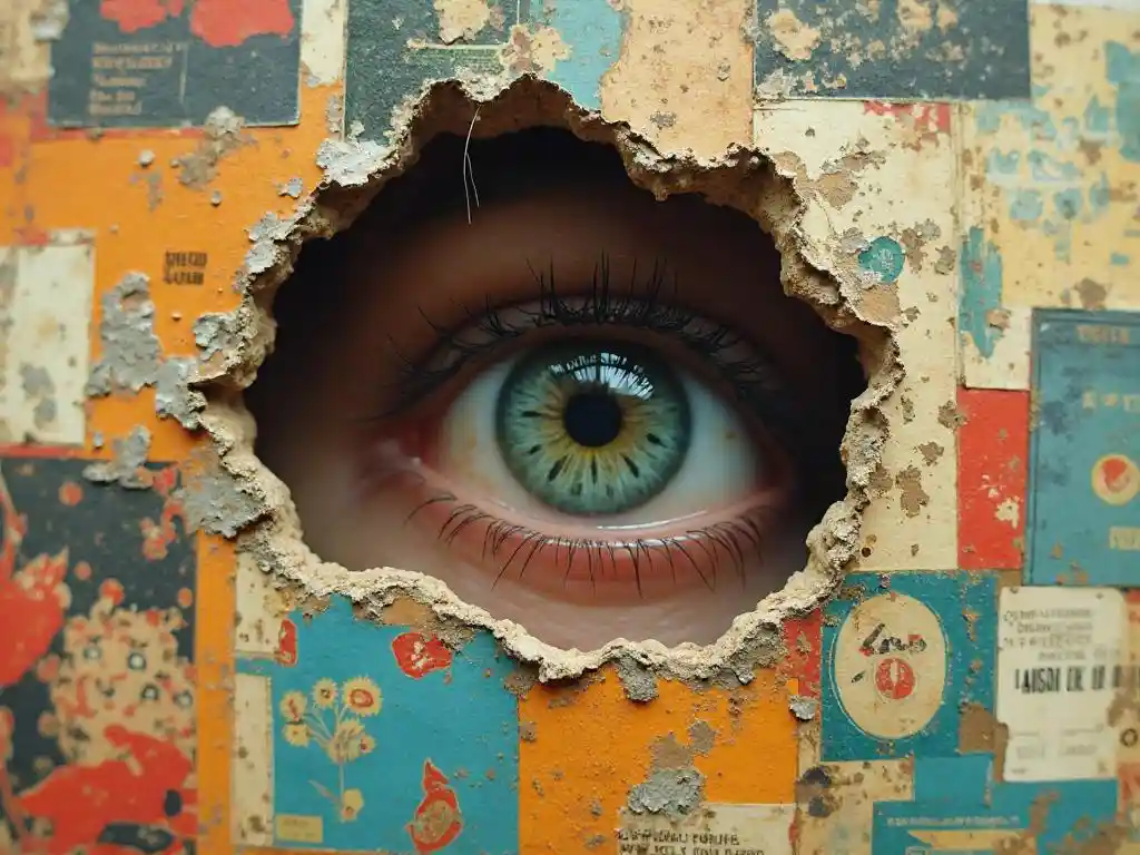 jicho peeking kutoka shimo kwenye ukuta, katikati ya collage machafuko, mabango ya zamani, mabango ya kawaida, kwenye ukuta.