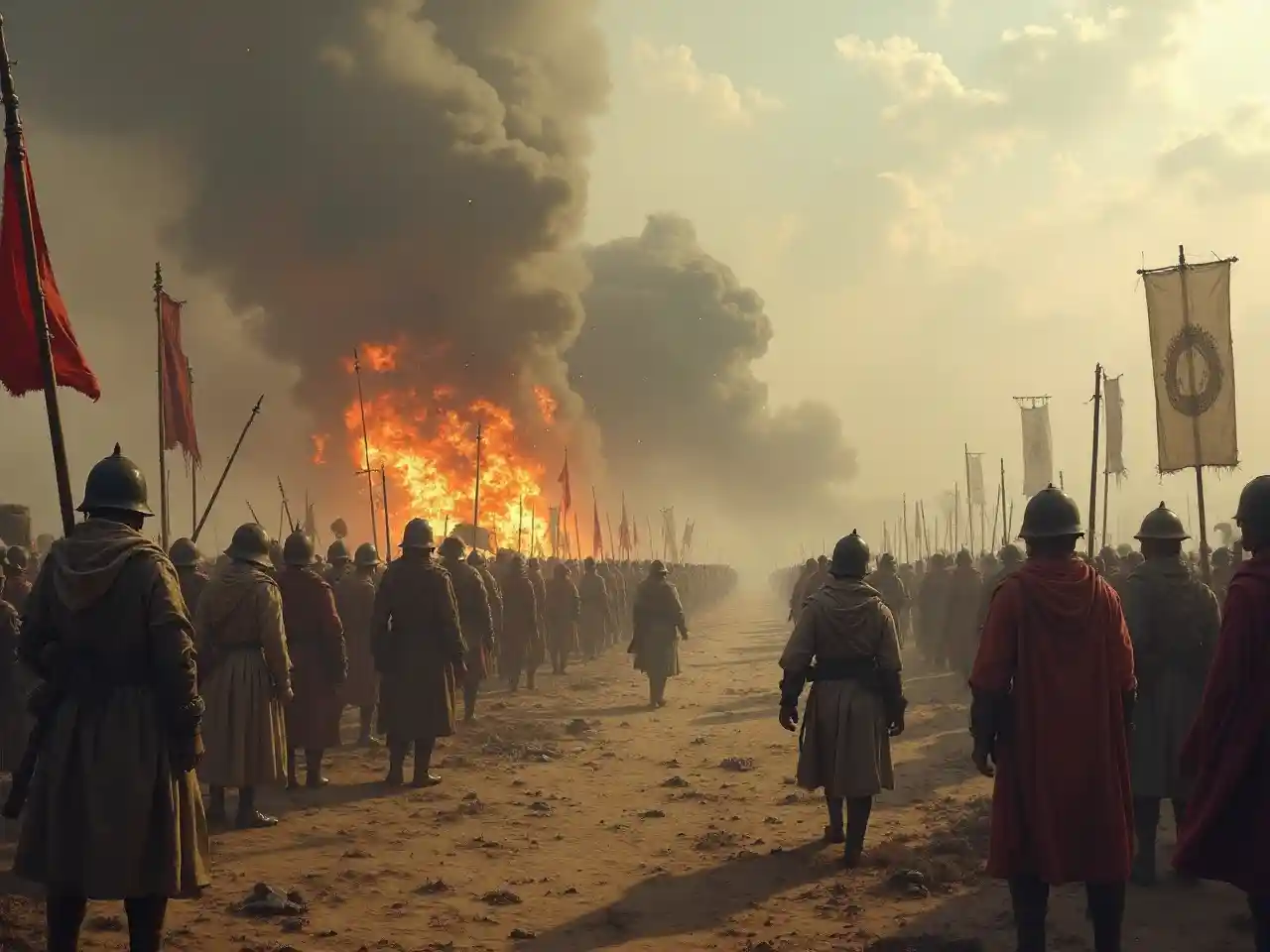 kufanya picha kwamba ya baada ya vita ambayo ni pamoja na bunduki watu hofu bendera kupasuka na mlipuko
