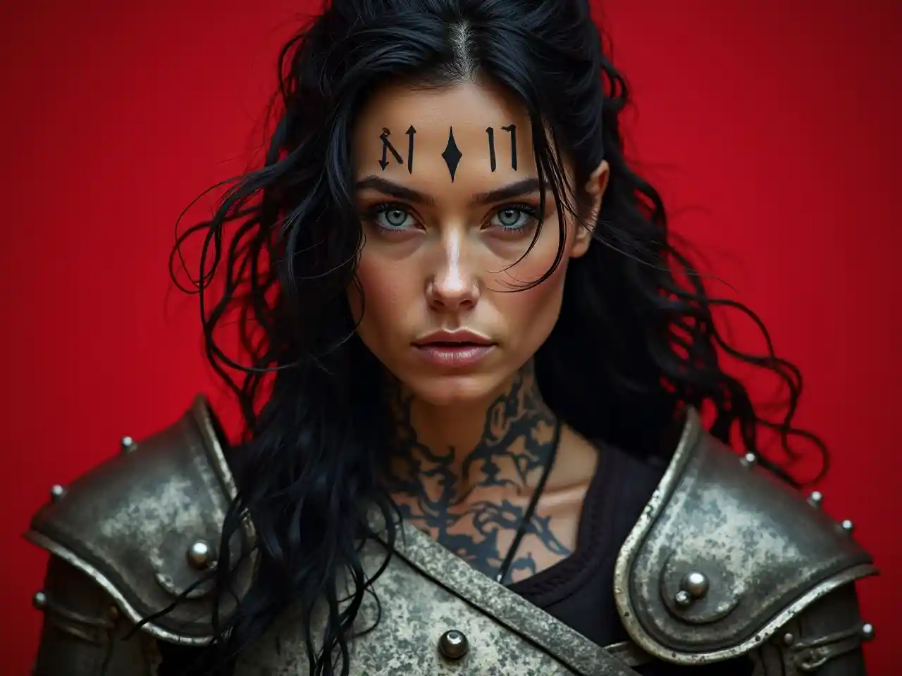Piga picha ya mwanamke shujaa mwenye nguvu ambaye ameunganisha vizuri silaha za chuma na kitambaa chepesi. Nywele zake nyeusi zenye kuvutia huzunguka mabega yake, zikionyesha tofauti nzuri na rangi ya kijani. Michoro tata hufunika uso na shingo yake, ikieleza kuhusu vita vilivyopiganwa na ushindi uliopatikana. Macho yake ya bluu yenye kung'aa yanaonyesha nguvu na azimio lake. Unda picha yenye kusisimua ya shujaa huyo, ukiunganisha nguvu na uzuri katika muundo wenye upatano na wenye kuvutia.