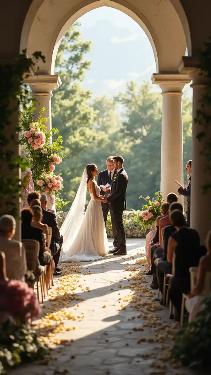 Picha nzuri ya sherehe ya arusi na wageni wakitazama.
