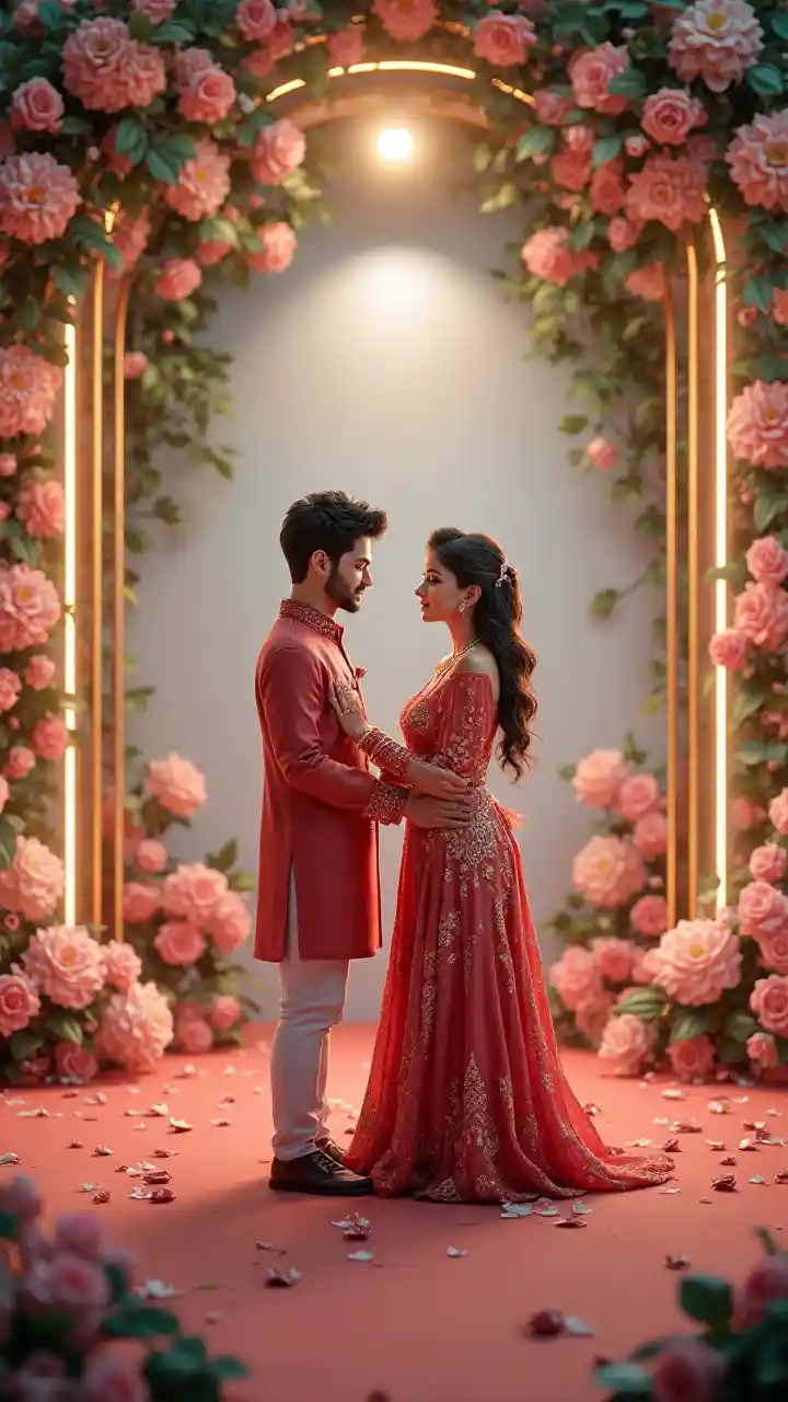 Mwang"Kujenga 3D utoaji wa kweli wa tabia harusi kazi mwanaume na mwanamke kuvaa mavazi ya jadi. ndani ya mapambo harusi hatua kabisa kufunikwa maua, mwavuli, taa za majani