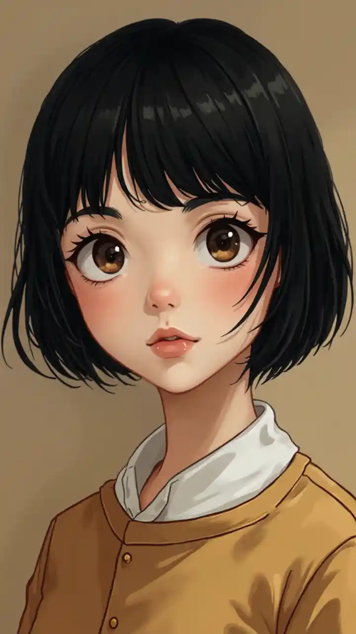 Kijapani kijana wa kike, nywele fupi nyeusi na bang, macho ya kahawia, Wes Anderson style