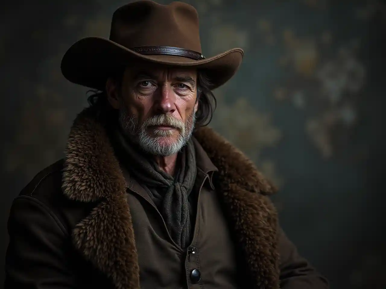 picha, zamani magharibi wawindaji, kofia ngozi, Bison ngozi kanzu, giza eneo, anga epic, kali juu ya maelezo