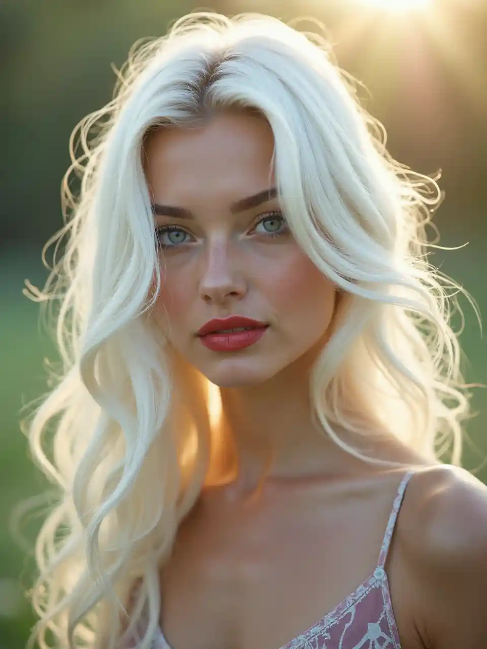 A (((beautiful woman))) with long, flowing white hair framing her delicate face, where the locks gracefully blow in the wind like delicate petals from a dandelion. Her eyes are a captivating shade of blue, complemented by defined red lips that add a hint of mystery to her expression. She exudes an air of confidence and playfulness, as she stands in a (softly backlit) environment that brings a sense of natural beauty and whimsy into focus
