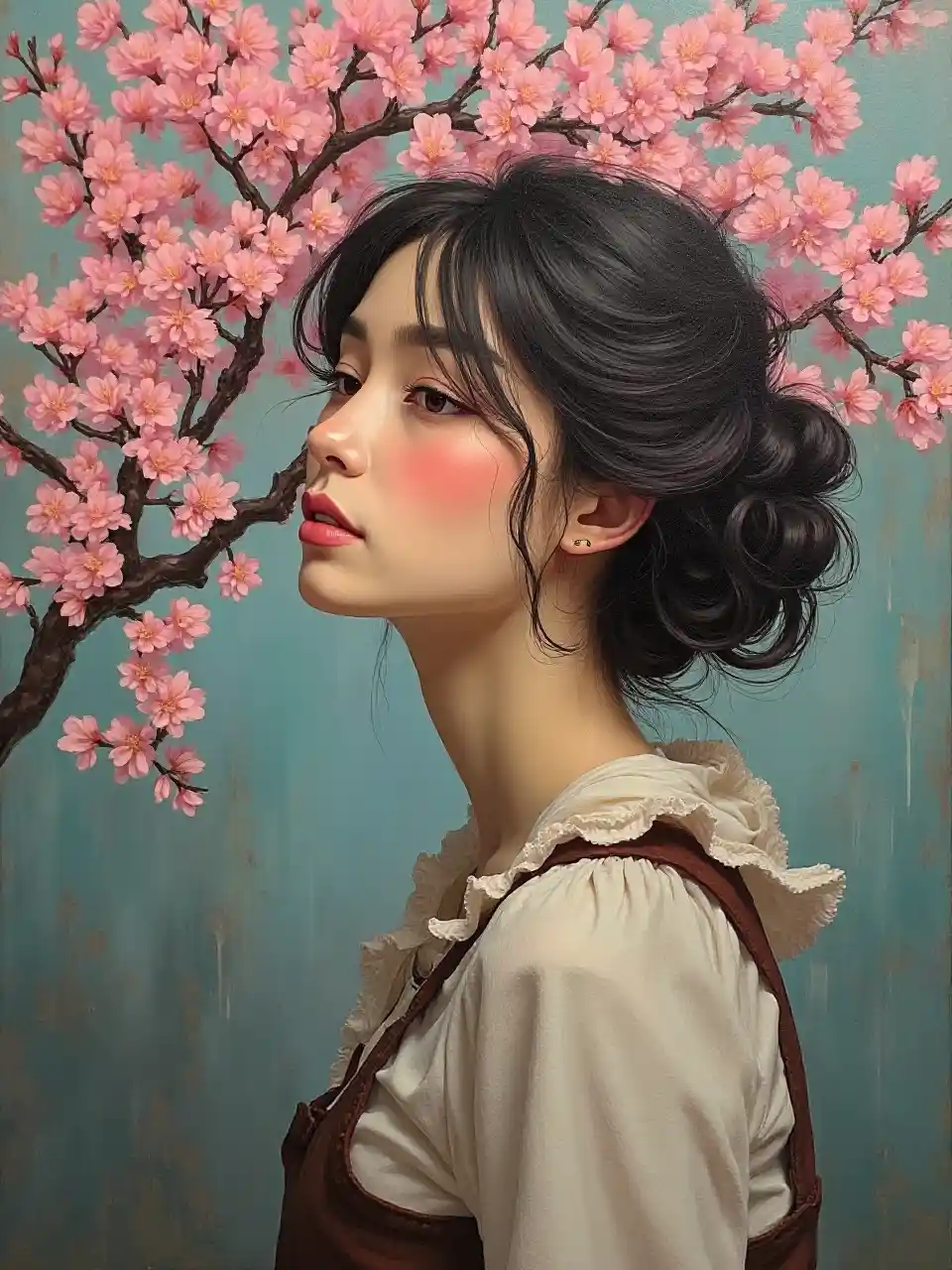 Mwanamke Mwenye Kufikiria Mambo Mengi na Michoro ya Mafuta ya Maua ya Cherry