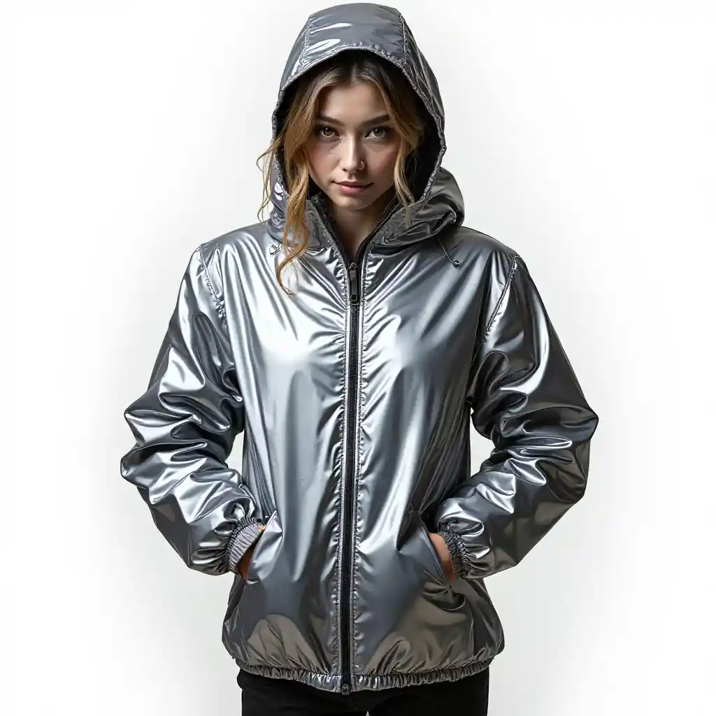 stxphPicha halisi ya koti la wanawake la chrome, na nguo ya kujitokeza, na background nyeupe