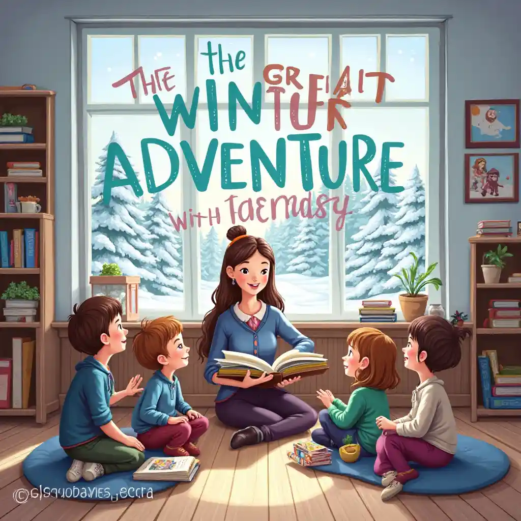 "Shule yenye starehe na madirisha makubwa yanayoonyesha barafu ya majira ya baridi kali. Ndani, watoto wamekusanyika kumzunguka mwalimu anayesoma kitabu. Kichwa 'The Great Winter Adventure with Friends' kimeandikwa kwa herufi zenye kupendeza na zenye rangi. Mtindo huo ni wa kipumbavu na wenye rangi".