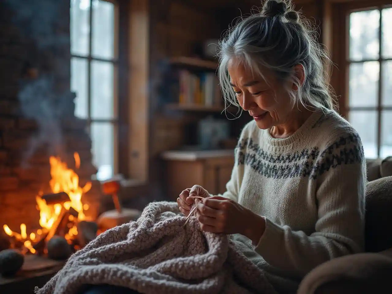 Mwanamke mmoja Msia mwenye umri wa miaka 79 ambaye ana mikunjo ya fedha, anavaa sweta iliyochongwa kwa vipande vya theluji. Moto wenye kunguruma na madirisha yenye barafu humweka ndani, na sindano zake zenye nguvu zinatoa joto na faraja katika mazingira ya baridi kali. Mikono yake huandaa faraja.