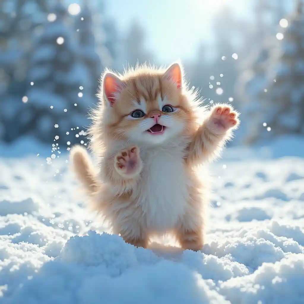 (겨울고양이), mandhari ya theluji, paka mwenye manyoya laini, msimamo wa kucheza, anacheza kwenye theluji nyeupe, anga baridi, anga ya kupendeza, anga ya bluu inayotofautiana na theluji, jua la joto linaloonyesha manyoya, kina, na kuvutia, kukamata kiini cha furaha ya majira ya baridi, ubora wa juu, uzoefu wa kuona.