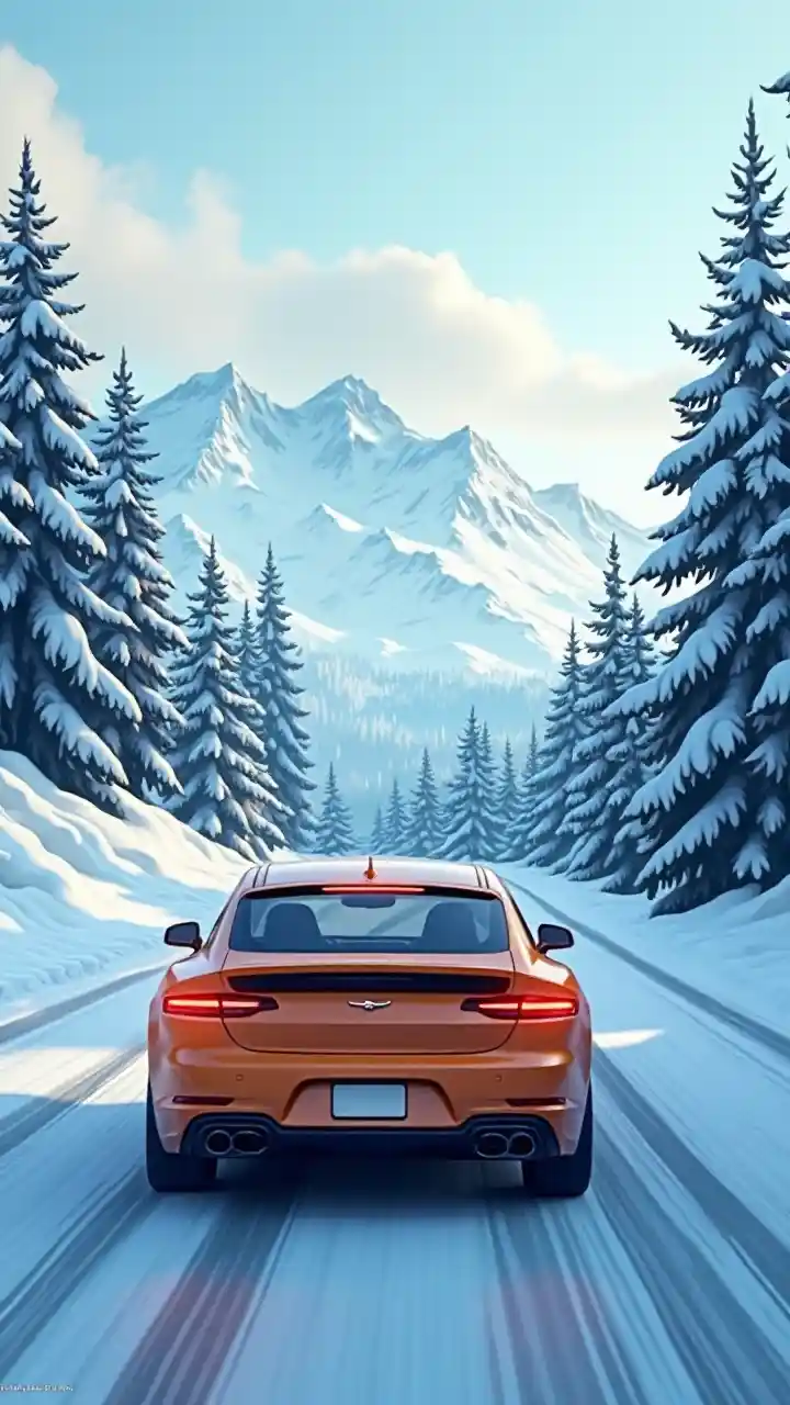 Bentleykisasa rangi ya machungwa gari nyuma ya mtazamo kuendesha gari juu ya barabara, mandhari ya theluji na miti ya mimea na milima mitindo vector, theluji, 64k