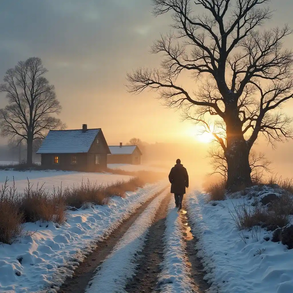 Mazingira ya majira ya baridi na nyumba chache za mashambani kwa mbali madirisha yao ya kuangaza joto . Kwenye kipaumbele barabara iliyogawanywa iliyofunikwa na mchanganyiko wa theluji na matope na alama za gurudumu la gari zinazungukwa na miti miwili mikubwa . Kushoto kuna kichaka kidogo cha miti . Mgeni mpweke wa kijiji anatembea barabarani . Ukungu huinuka kutoka ardhini na kutokeza anga ya anga . Jua linapochwa .