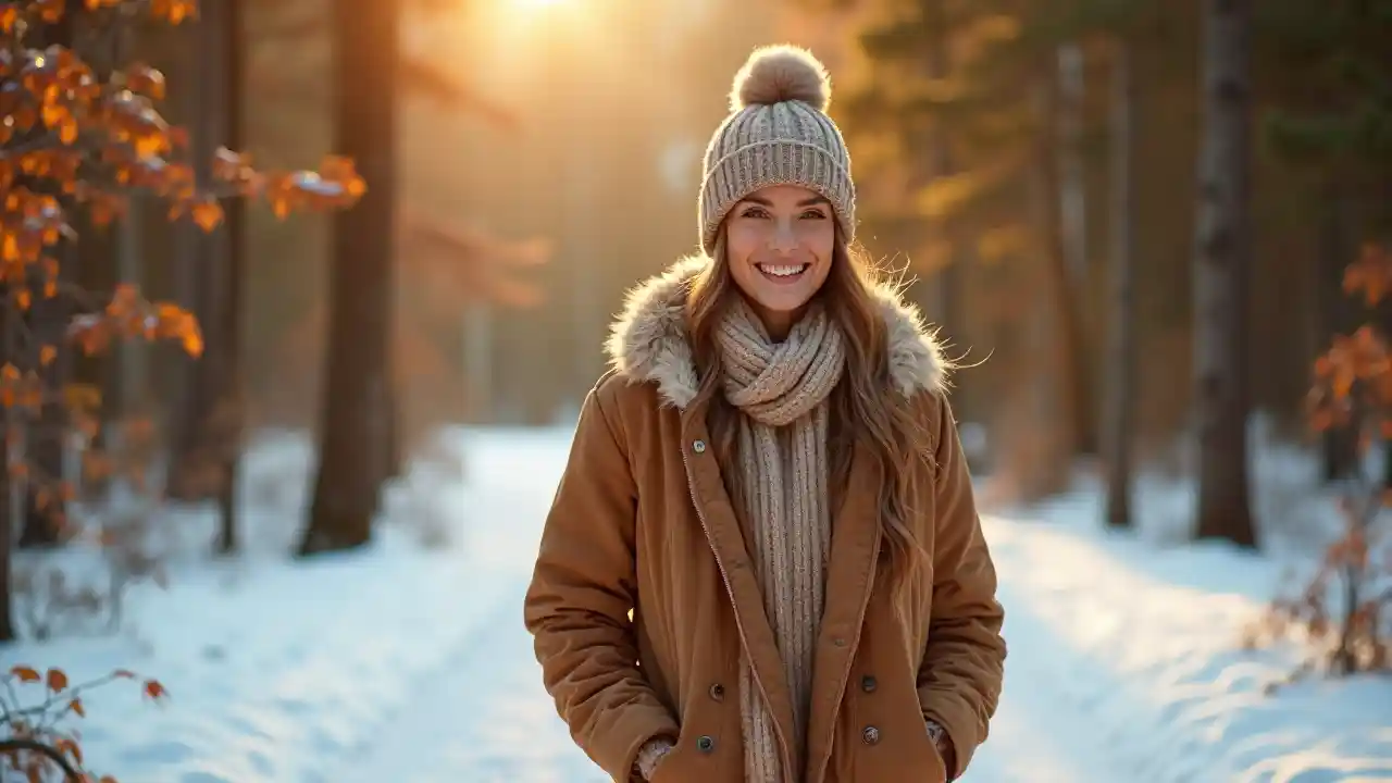(mfano kutembea katika msitu wa baridi iliyojaa theluji kando ya njia), kuvaa (mavazi ya baridi ya joto), (tabasamu ya joto), picha ya kifahari, mandhari ya asili, msitu wa jua, rangi ya vuli, mwanga wa mwanga wa joto, mazingira ya kupendeza, mitindo ya nje, textures ya kitani, ubora wa juu, HD.