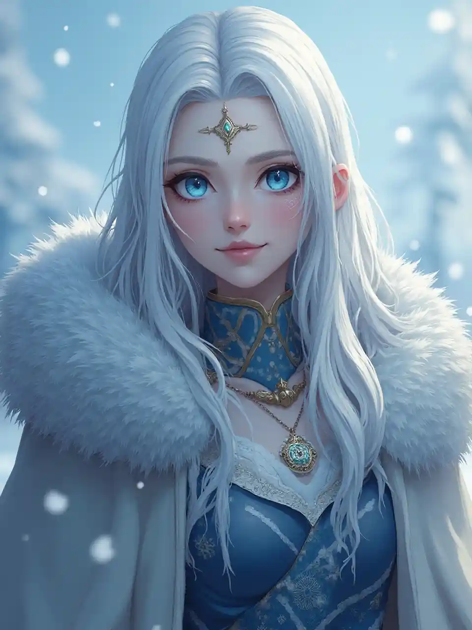 EleanorAskari wa majira ya baridi kali, nywele nyeupe, macho ya bluu, koti lenye manyoya, mandhari ya theluji, tabia ya utulivu