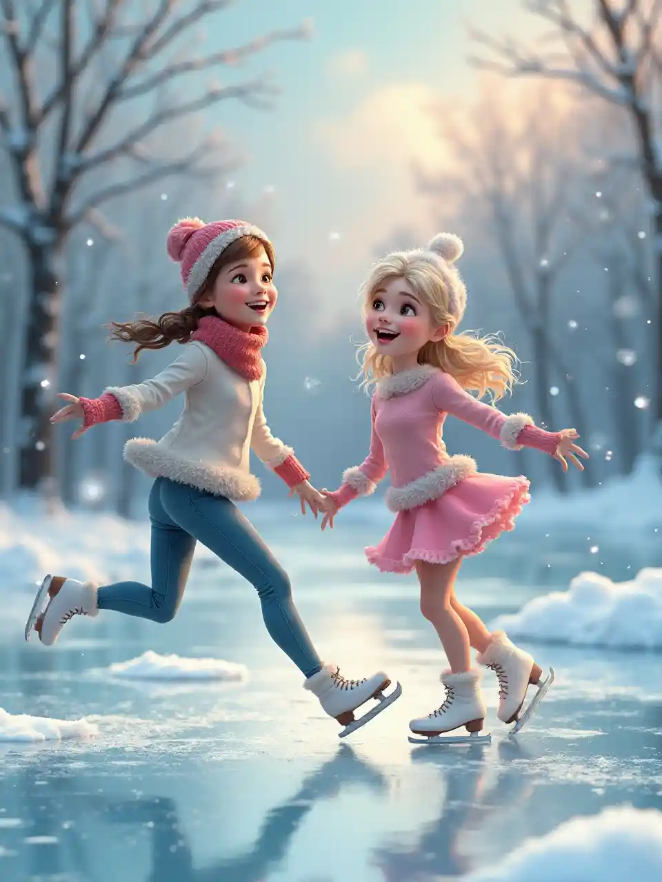 (wachezaji wa barafu wa ajabu), bwawa la barafu lenye kuvutia, rangi laini za pastel, mazingira ya sherehe, vivuli vyenye kung'aa kwenye barafu, mandhari ya majira ya baridi yenye kuvutia, vipande vya theluji vyenye kuvutia vinaanguka kwa upole, hisia za furaha kwenye nyuso za wachezaji wa barafu, mavazi ya kina ya barafu, nafasi za kucheza, mandhari yenye amani yenye miti yenye baridi, mwangaza wa giza, mazingira yenye mambo mengi, yenye kuvutia na ya ajabu.
