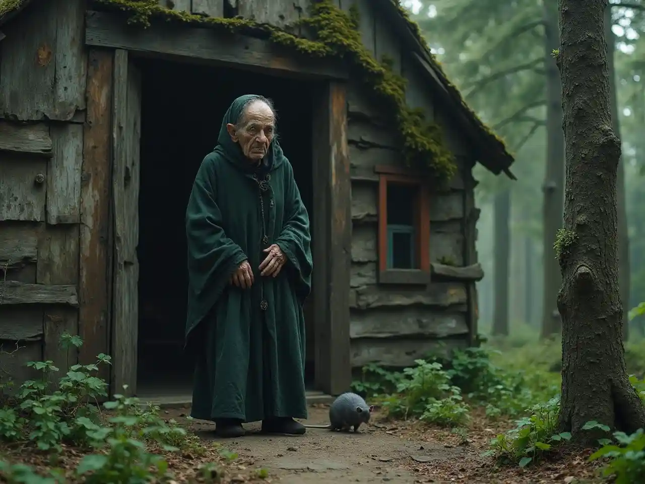 Mchawi mzee amevaa kijani giza, mbaya na pua kubwa na vidonda, nyuma curved kuonekana kutoka mbele, panya kijivu kwa miguu yake, amesimama katika mlango wa nyumba ya zamani tumbling katika wazi ya msitu. Kuonwa kutoka nje.