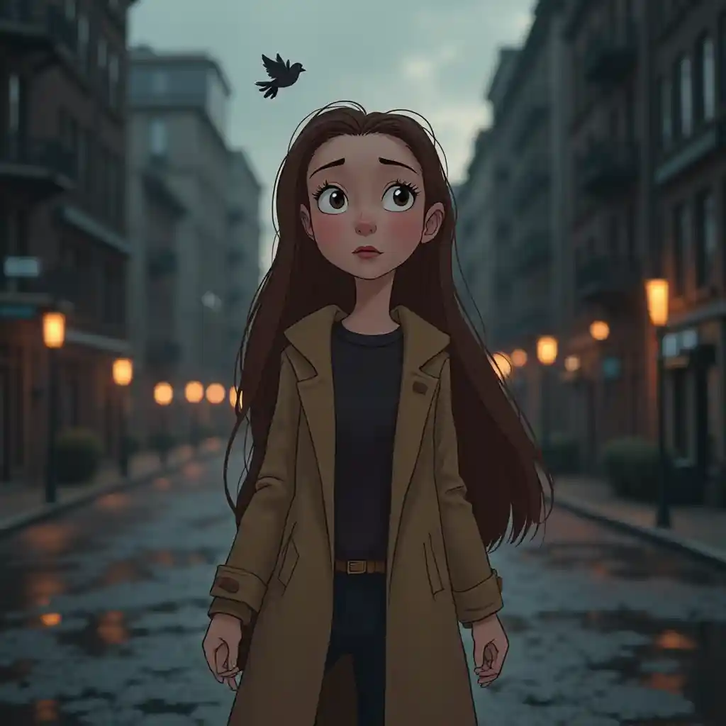 nywele za kahawia mwanamke katika koti beige peke yake katika mji wa giza na ndege kutafuta familia yake, toleo Disney, toleo Pixar, 4K