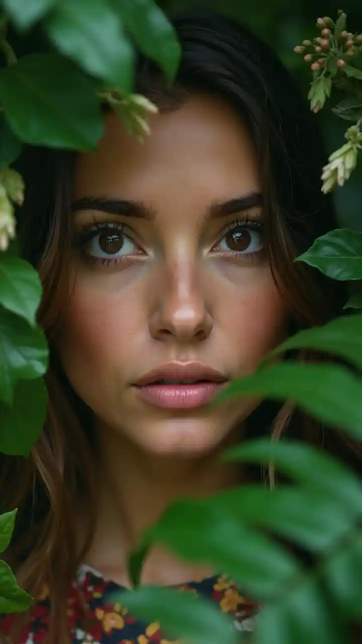 macho na midomo ya mwanamke mwenye uzito kupita kiasi akitazama majani na maua ya msitu