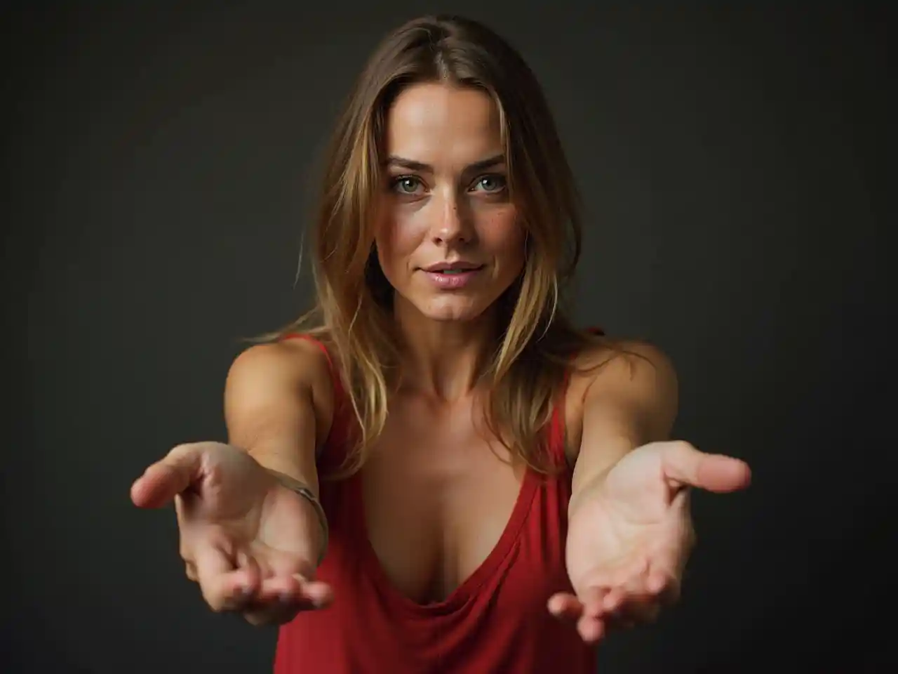 Mwanamke wa miaka 30 nywele ndefu bila shati, nyekundu juu, kufikia mikono nje ya mbele