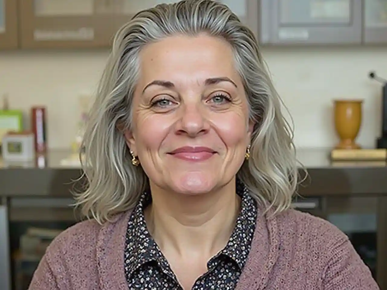 Mwanamke mwenye umri wa miaka 40 mwenye nywele nyeupe na koti jekundu