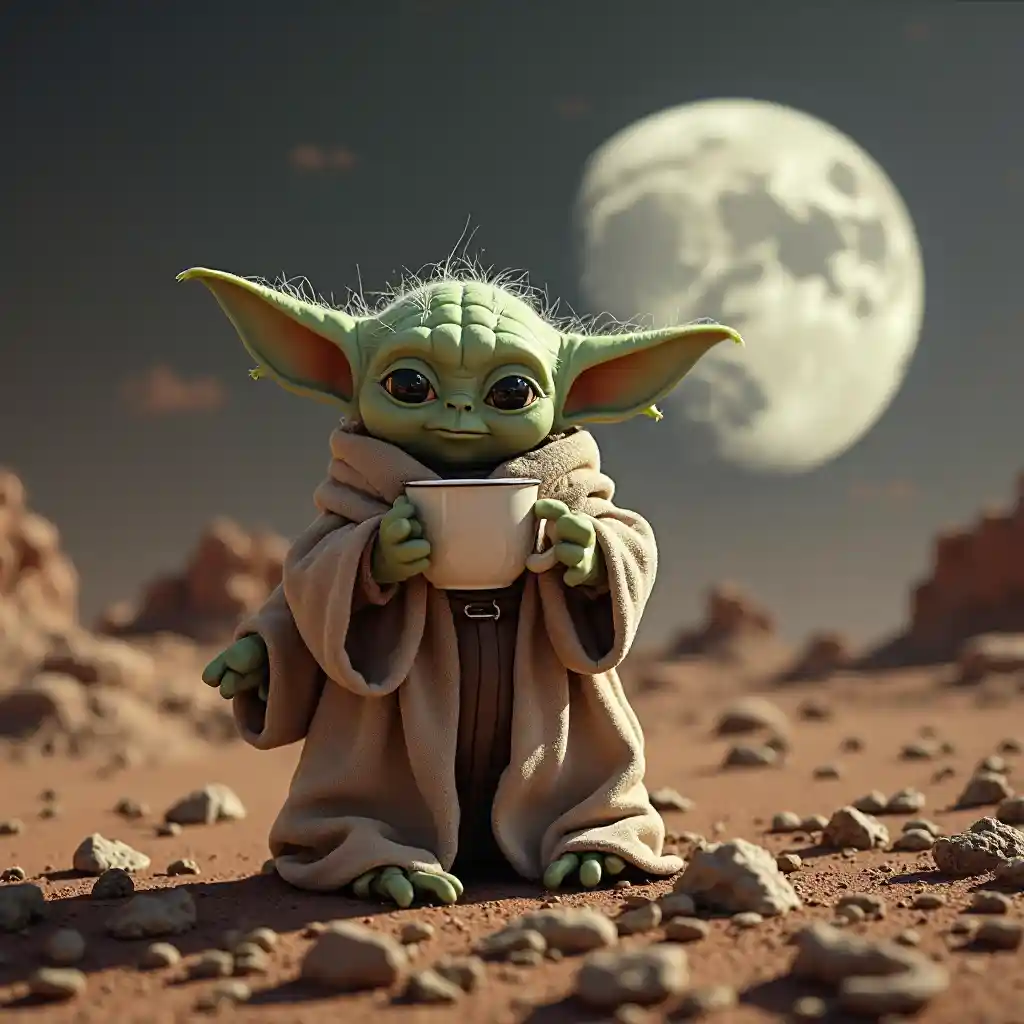 Yoda toy kunywa kahawa kwenye sayari ya mbali