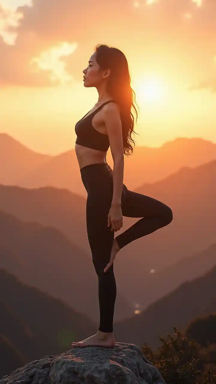Kijana, breathtakingly nzuri Taiwan mwanamke (ultra kina) na sura ya kuvutia Kuvaa nguo za kitaalamu za yoga za shingo ya V juu ya mlima kufanya yoga kwa kunyoosha mwili wake, akiwa na mguu mmoja juu ya anga na machweo mazuri na ufunguo wa dhahabu nyuma yake, mwanga wa joto. Picha ya karibu Mtazamo wa mwili wote. Ultra-kweli, mtindo wa sinema, azimio 4K, mwenendo juu ya ArtStation. Maelezo ya Juu Sana