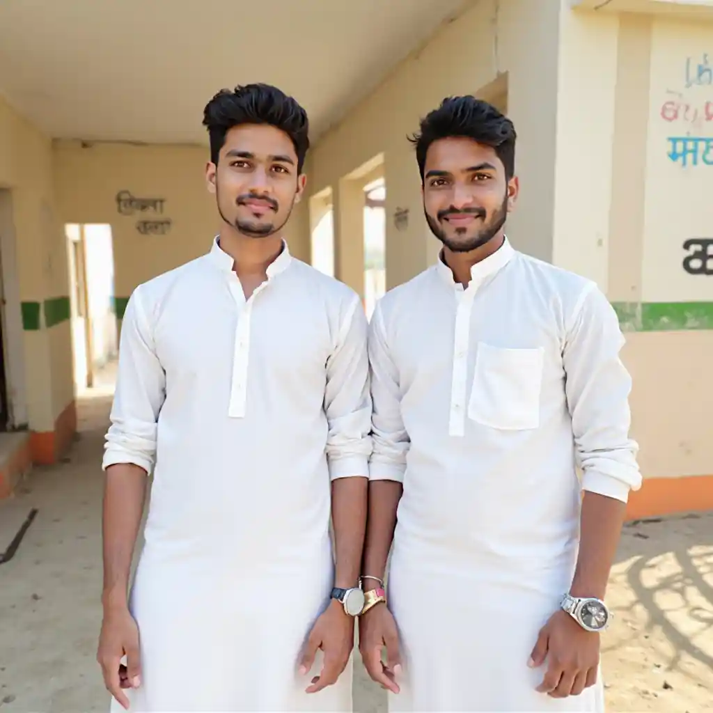 Wavulana wawili wanasimama kando kando ya ukuta ulioangazwa na jua na kupakwa rangi nyepesi, na hilo linaonyesha kwamba siku ni yenye joto. Wakiwa wamevaa mavazi meupe ya kitamaduni, mavazi yao yanatumiwa kwa saa za kisasa, na hivyo kuchanganya urithi wa kitamaduni na mtindo wa kisasa. Nyuma ina muundo rahisi ulio na neno " " (linalomaanisha "ndani" kwa Kihindi) na mistari ya machungwa na kijani, labda inawakilisha shule ya ndani au eneo la jamii. Maneno ya vijana hao yanaonyesha uhakika na urafiki, na kuchochea nguvu za ujana na roho ya ushirika katika mazingira hayo yenye msisimuko.