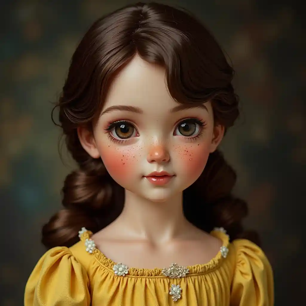 Highly kina vijana ishirini Regency enzi msichana, chocolate nyekundu nywele, giza macho mwanga, moyo sura ya uso na cheekbones high na ngozi nyepesi na freckles katika pua yake nyeti, rangi ya majira ya joto smirking