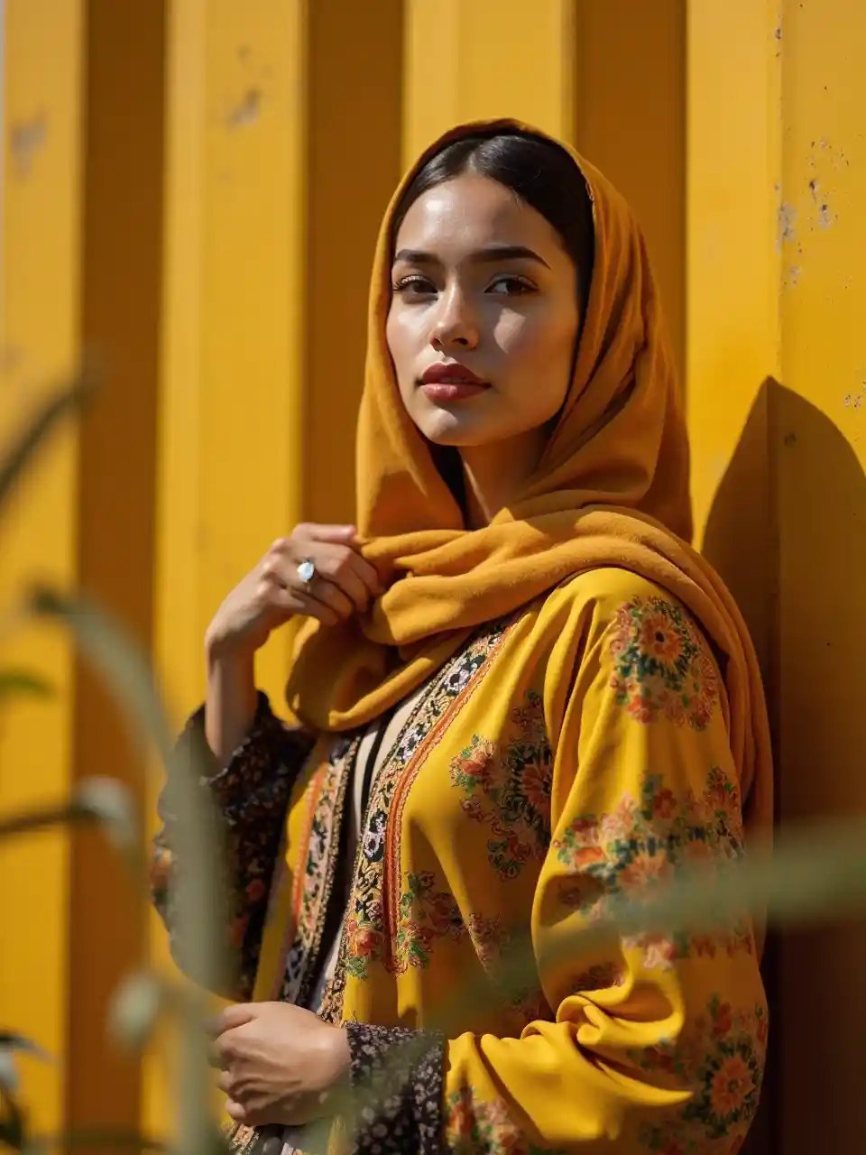 Msichana mmoja anayejifunika kwa nuru ya asili, anajionyesha akiwa ametulia. Mavazi yake yana mitindo yenye kupendeza ya rangi ya machungwa, kijani, na nyeusi, na hiyo inapatana na shati la dhahabu ambalo limefungwa vizuri juu ya kichwa na mabega. Anapotazama juu kidogo, anaonyesha udadisi na kujiuliza maswali, kana kwamba amepoteza akili. Muundo huo unaonyesha tabia yake ya utulivu, iliyowekwa na kitambaa cha mavazi yake, wakati kitu cha blur katika mstari wa mbele huongeza mchoro wa sanaa, kuongeza hali ya jumla ya uzuri na utajiri wa kitamaduni.
