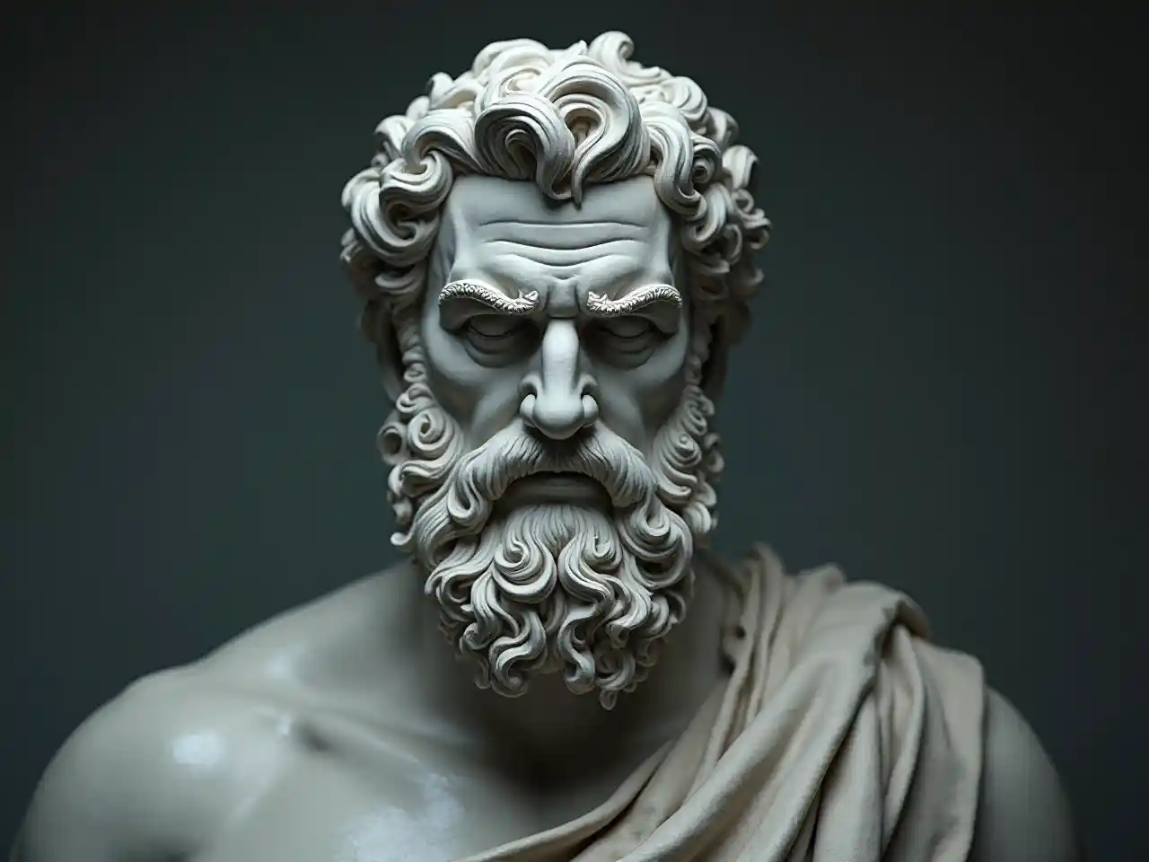 MwangPicha halisi ya marumaru nyeupe ya Kigiriki sanamu ya Zeus, background neutral, moody, angry, photorealistic, movie scene, super detailed, hyperrealistic, Batman