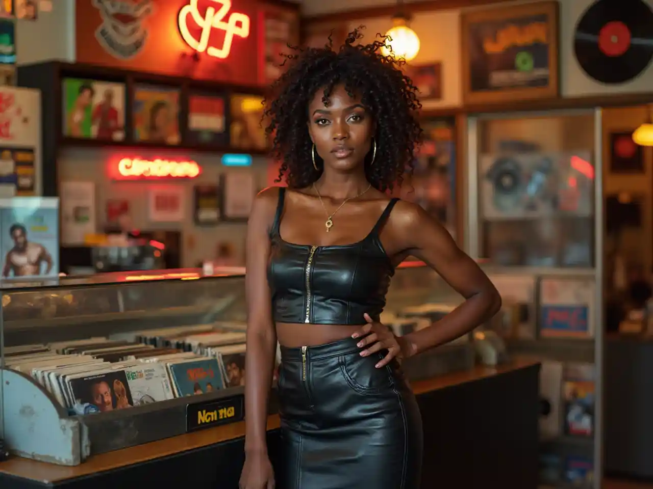 20 ఏళ్ల చివరలో ఉన్న ఒక ఆత్మవిశ్వాసం గల నల్లజాతి మహిళ ఒక పాతకాలపు రికార్డు దుకాణంలో పోజులు ఇస్తుంది, ఆమె తోలు క్రాప్ టాప్ మరియు స్కర్ట్ ఆకట్టుకుంటుంది, వినైల్ రికార్డులు మరియు నియాన్ సైన్ ఒక రెట్రో వైబ్ సృష్టించడం.