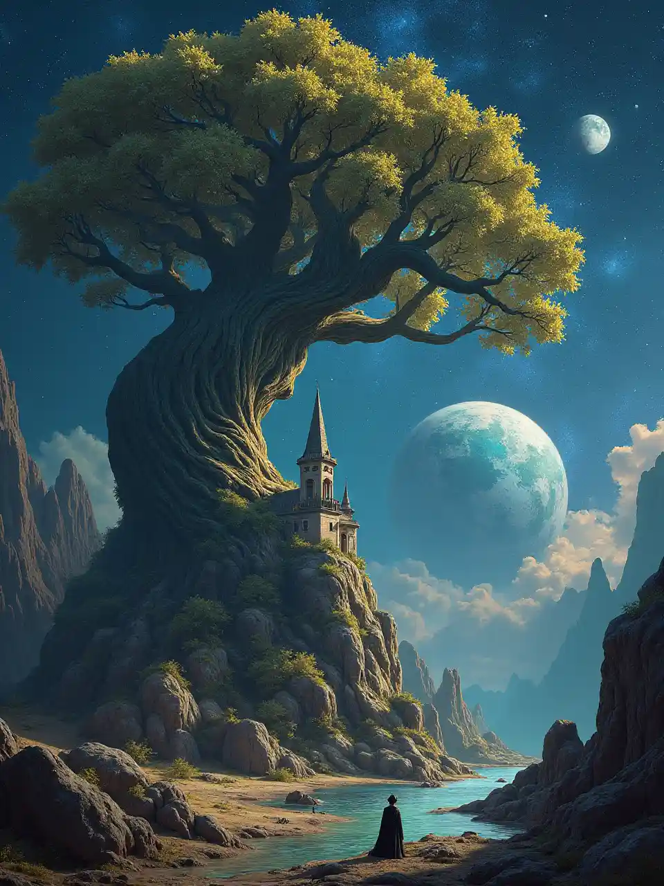 ఒక భారీ వక్రీకృత చెట్టు మరియు ఎల్వ్స్ కోటతో ఒక ఫాంటసీ ప్రపంచం