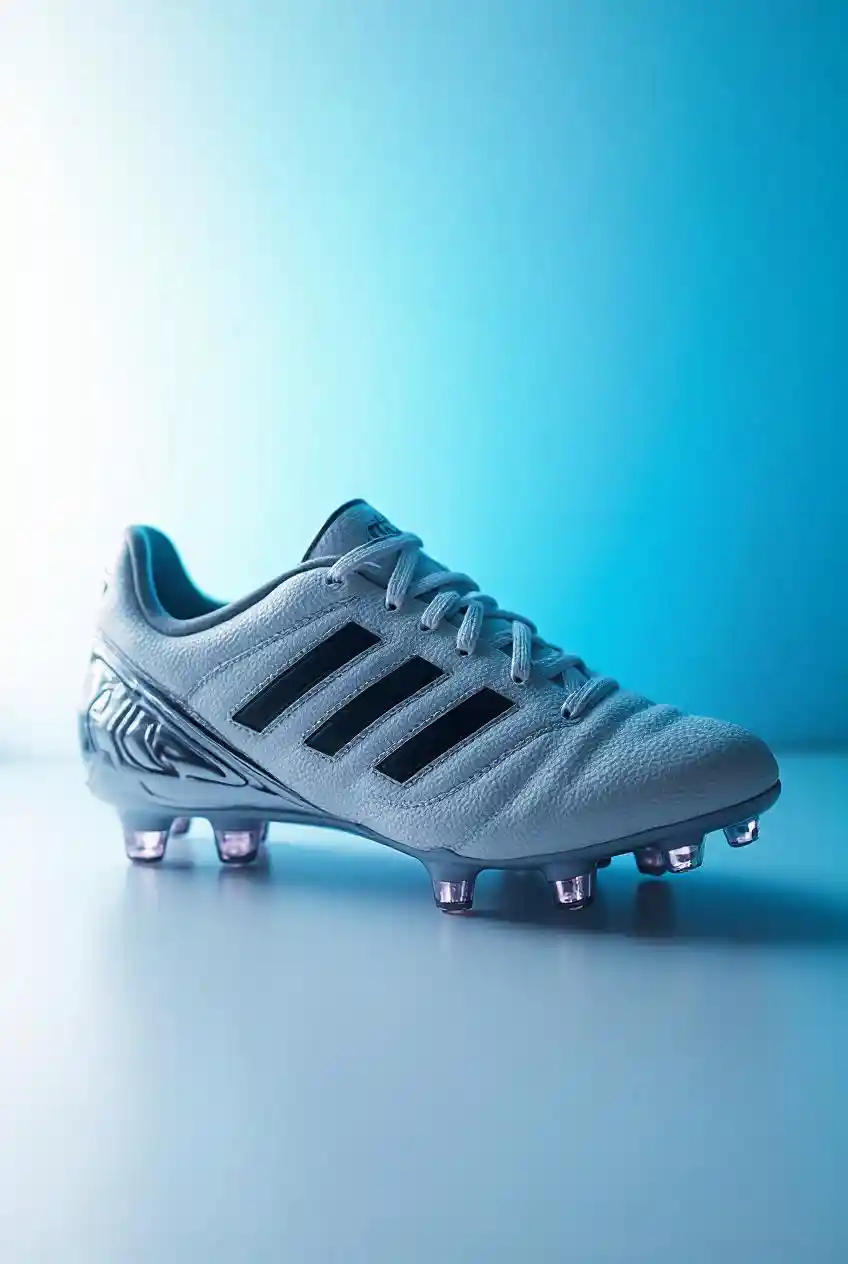Emmaక్లోజ్ అప్, ఉత్పత్తి వివరాలు, మినిమలిస్ట్ ఇలస్ట్రేషన్ ఒక క్రోమ్ అడిడాస్ ఫుట్బాల్ షూ యొక్క నైరూప్య కళ ఒక తెలుపు నీలం ప్రవణత నేపథ్యంలో