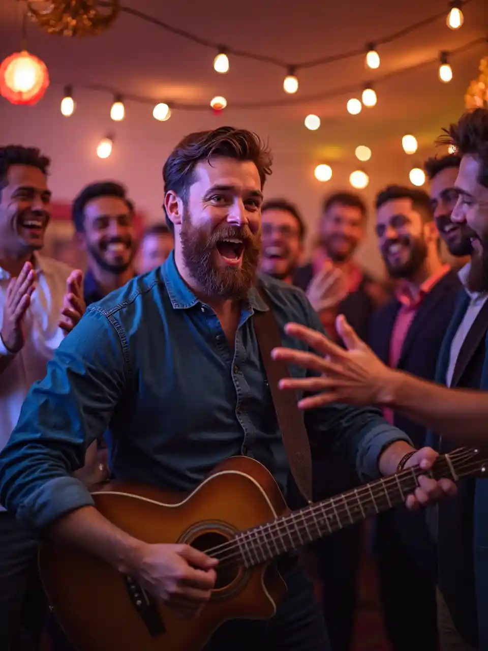 ఒక ఉల్లాస వాతావరణంలో, ఒక సమూహం పురుషులు సంతోషాన్ని మరియు సహచరత్వాన్ని ప్రసరింపజేస్తారు, వారు ఒక ఉత్సవంలో పాల్గొనేటప్పుడు శక్తివంతమైన వ్యక్తులను ప్రదర్శిస్తారు. ఒక వ్యక్తి, మందపాటి గడ్డం, గిటార్ పట్టుకొని, అతని సాధారణ దుస్తులు సమీపంలోని ఇతరుల మరింత అధికారిక దుస్తులతో విభేదించబడ్డాయి. ఈ దృశ్యం మృదువైన, వెచ్చని లైట్ల ద్వారా వెలిగింపబడుతుంది, ఇది ఒక సెలవుదినం లేదా ముఖ్యమైన సంఘటన చుట్టూ ఒక ఇండోర్ సమావేశాన్ని సూచిస్తుంది. పార్టీ అలంకరణల సూచనలతో రంగురంగుల నేపథ్యం పండుగ సారాన్ని నొక్కి చెబుతుంది, నవ్వు మరియు సంగీతం భాగస్వామ్య క్షణం అంతటా ప్రతిధ్వనిస్తాయి, కలిసి జరుపుకునే భావనను సంగ్రహిస్తాయి.