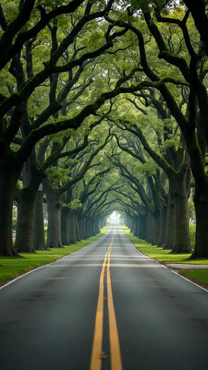 Lunaదయచేసి రోడ్డు యొక్క ప్రతి వైపు ఓక్ చెట్ల తో ఒక రహదారి యొక్క ఒక చిత్రాన్ని సృష్టించండి.