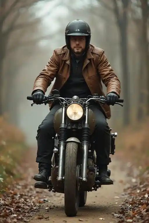 Robinపురాతన మోటార్ సైకిల్, గుర్రపు స్వారీ, ప్రయాణం, గుర్రపు స్వారీ నెమ్మదిగా, గాడ్, గోధుమ తోలు జాకెట్, నలుపు గుర్రపు స్వారీ చేతి తొడుగులు, ఇంజనీర్ బూట్లు