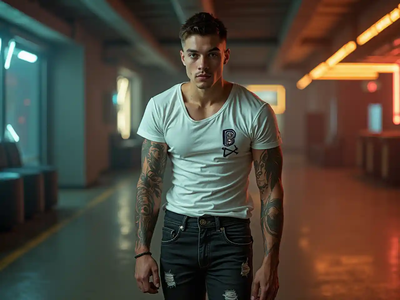 สร้างภาพของชายหนุ่มชื่อแอนดี้-เอ็ม อายุ 23 ปี มีลักษณะที่น่าสนใจและมีลักษณะที่น่าสนใจ ผมสั้น มีการโกนให้เรียบร้อย ผิวหนังมีสีแดงเล็ก ๆ ตาสดใสและมีสีดํา ใบหน้าแสดงถึงความกล้าหาญและความมั่นใจ ความตลกใจในตัวเองเล็ก ๆ ได้แสดงออกมาในรอยยิ้มครึ่งและการมองที่ไม่ชอบ รอยแผลบาดที่สว่างเพิ่มความลึกและลักษณะของภาพ ร่างกายมันอ่อนแอ ฟิต แอทเลตส์ ครอบคลุมด้วยการวาดรูปของเด็ก การสวมเสื้อสีขาวที่เรียบง่าย เน้นความผ่อนคลายของร่างกาย กางเกงยีนส์สีดําที่มีรอยขีดขืนและอิสระ รองเท้าหนังที่มีเครื่องปั้นโลหะเพิ่มประกอบของชายและเย็น ภาพของนักกีฬาแข่งที่ใต้ดินที่มีองค์ประกอบของวงการจักรวาล: เบื้องหลังคือผสมผสานระหว่างพื้นที่ในอนาคตและห้องกีฬา, สร้างผลของความเคลื่อนไหวและการเคลื่อนไหว เสียงหลักของภาพนั้นอบอุ่นพอๆ เน้นความหนุ่มและพลังของตัวละคร